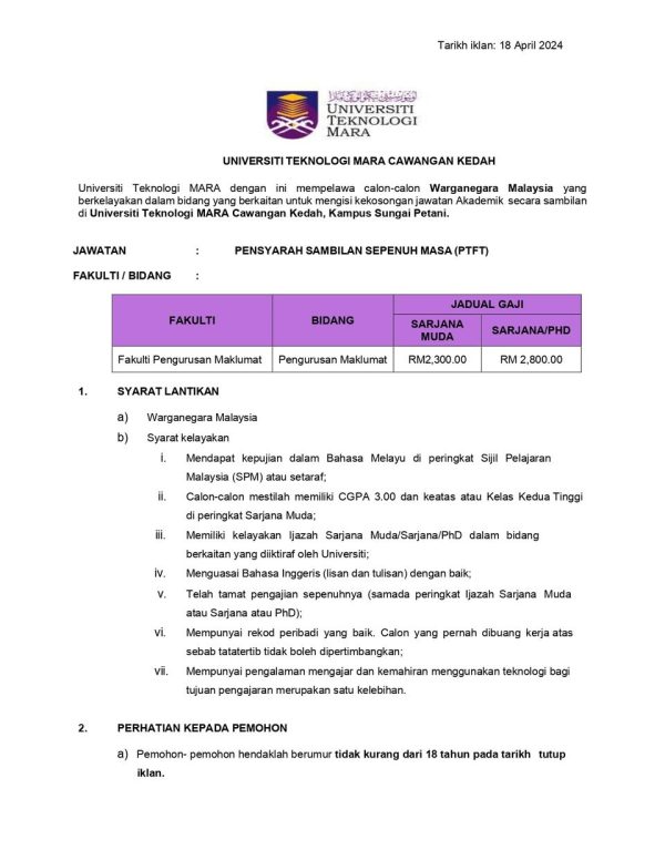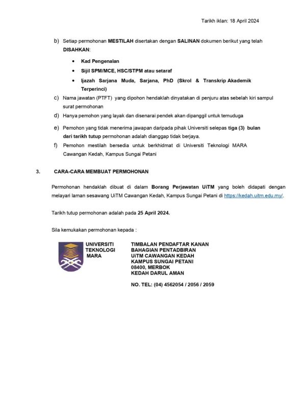 Iklan Universiti Teknologi MARA (UiTM) Cawangan Sungai Petani Like serta Ikut Facebook Kami, follow Chanel WhatsApp Jawatan Kosong & Telegram Portal SPA9 untuk capaian pantas kekosongan jawatan daripada kami sekarang.