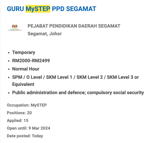 Permohonan jawatan ini boleh dibuat melalui Portal MyFutureJobs. Sila ke Portal MyFutureJobs dan Masukkan Kata Carian yang ingin dicari “PEJABAT PENDIDIKAN DAERAH SEGAMAT” di bahagian carian untuk memohon jawatan yang diiklankan.