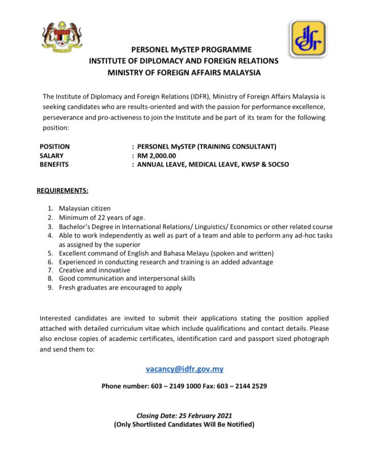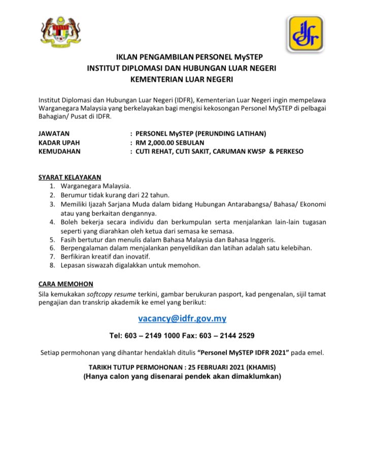 Jawatan Kosong Institut Diplomasi Dan Hubungan Luar Negeri (IDFR) Like serta Ikut Facebook Kami, follow Chanel WhatsApp Jawatan Kosong & Telegram Portal SPA9 untuk capaian pantas kekosongan jawatan daripada kami sekarang.