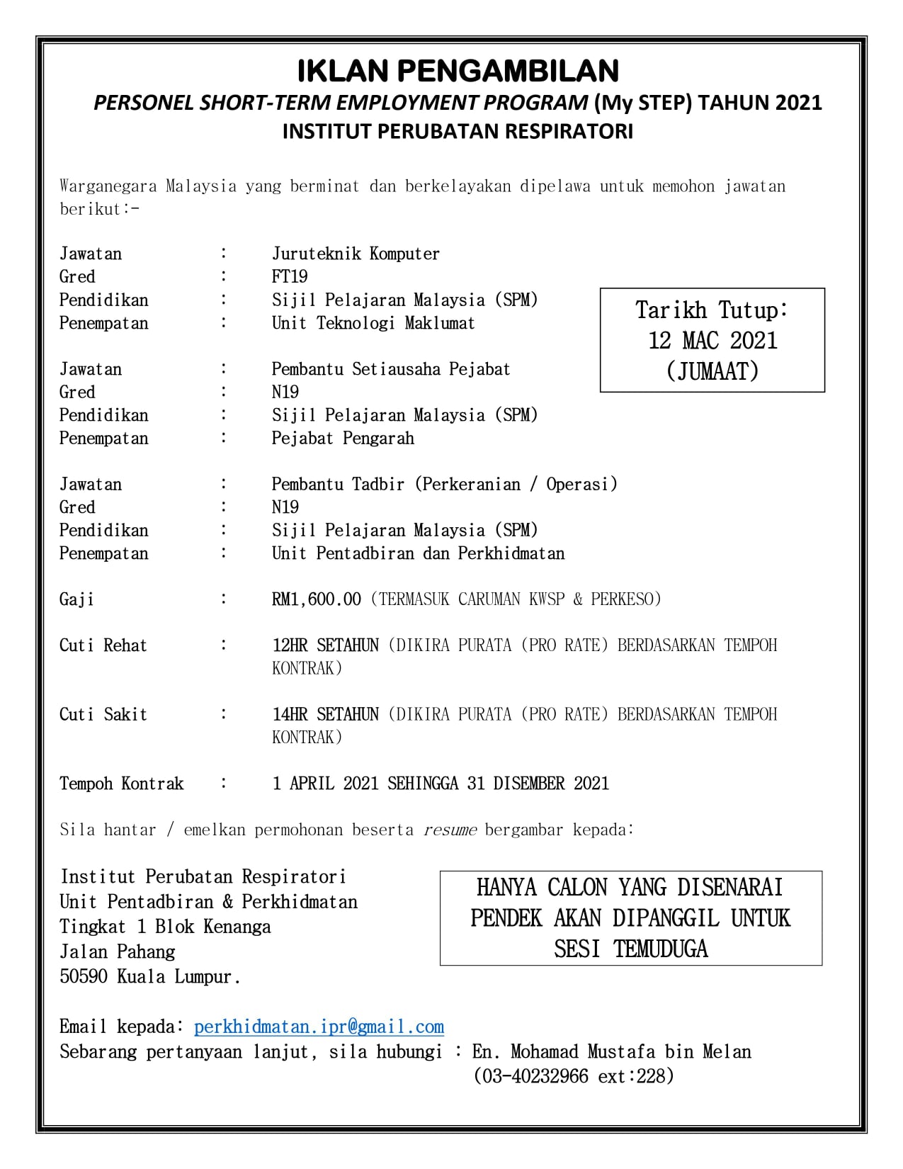 InfoKerjaya / MANUAL / JAWATAN KOSONG INSTITUT PERUBATAN RESPIRATORI