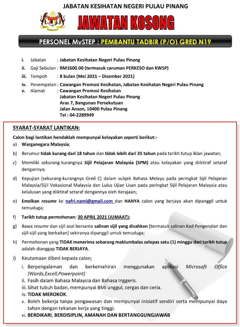Jawatan Kosong Jabatan Kesihatan Negeri Pulau Pinang