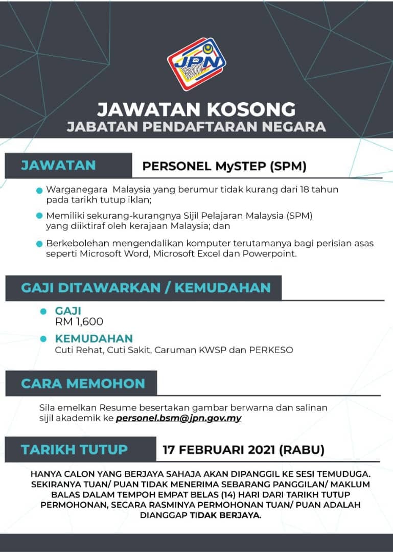 Jawatan Kosong Jabatan Pendaftaran Negara Like serta Ikut Facebook Kami, follow Chanel WhatsApp Jawatan Kosong & Telegram Portal SPA9 untuk capaian pantas kekosongan jawatan daripada kami sekarang.