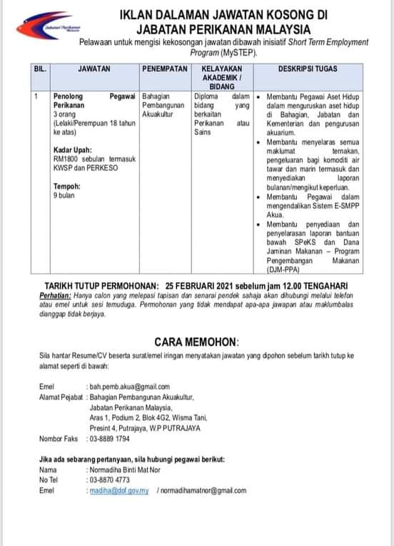 Jawatan Kosong Jabatan Perikanan Malaysia Like serta Ikut Facebook Kami, follow Chanel WhatsApp Jawatan Kosong & Telegram Portal SPA9 untuk capaian pantas kekosongan jawatan daripada kami sekarang.