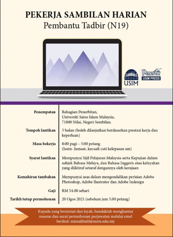 Jawatan Iklan Universiti Sains Islam Malaysia (USIM) Like serta Ikut Facebook Kami, follow Chanel WhatsApp Jawatan Kosong & Telegram Portal SPA9 untuk capaian pantas kekosongan jawatan daripada kami sekarang.