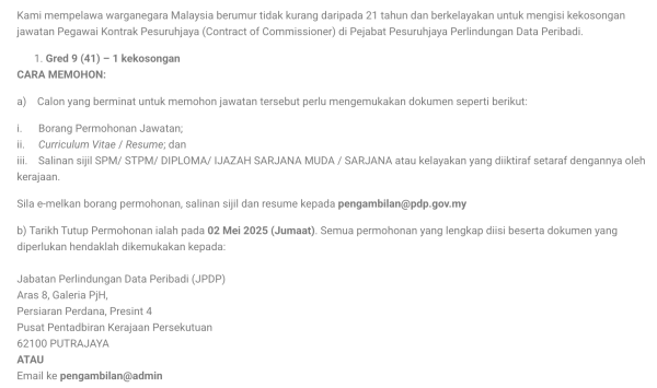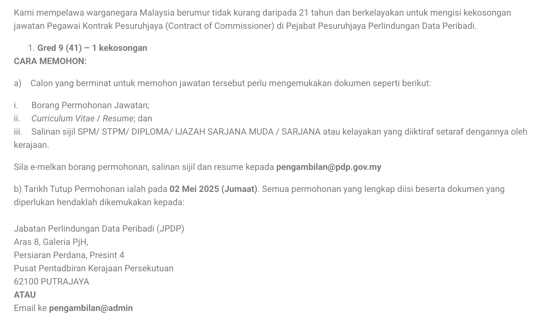 Jawatan Kosong Jabatan Perlindungan Data Peribadi Malaysia Like serta Ikut Facebook Kami, follow Chanel WhatsApp Jawatan Kosong & Telegram Portal SPA9 untuk capaian pantas kekosongan jawatan daripada kami sekarang. Klik Jawatan Disini