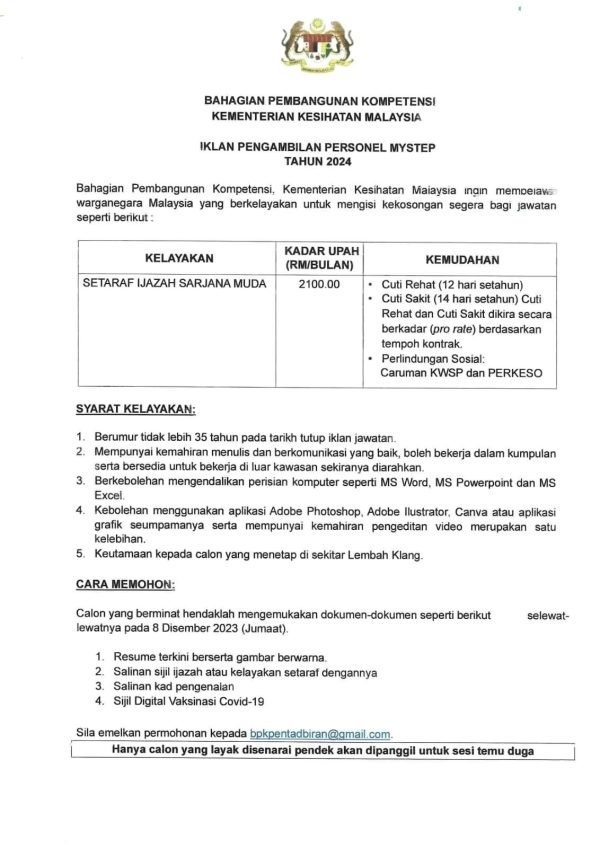 Jawatan Kosong Terkini Kementerian Kesihatan Malaysia (KKM) ~ Personel Mystep Like serta Ikut Facebook Kami, follow Chanel WhatsApp Jawatan Kosong & Telegram Portal SPA9 untuk capaian pantas kekosongan jawatan daripada kami sekarang.
