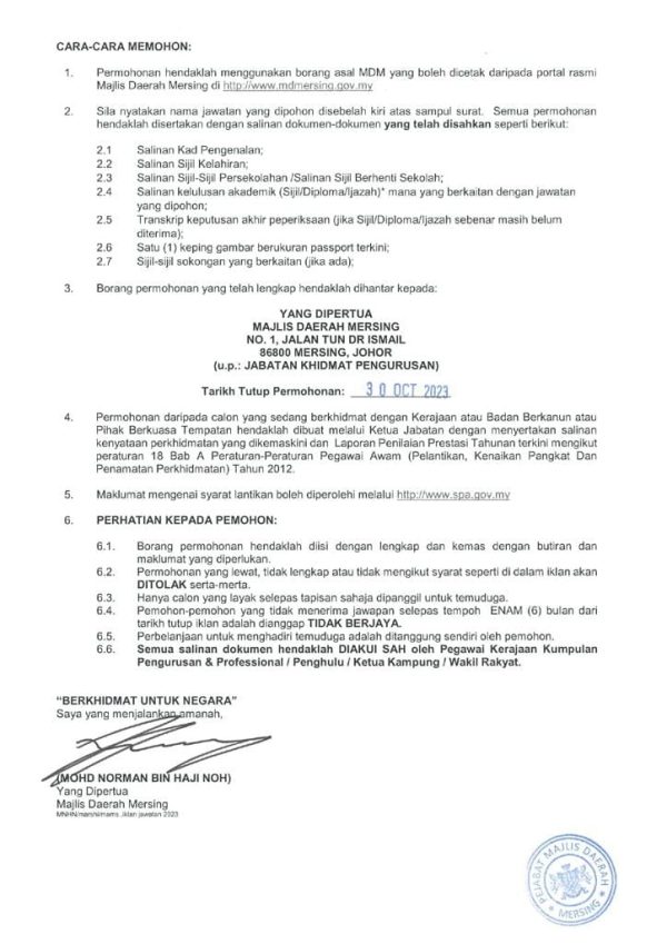 Jawatan Kosong Terkini Majlis Daerah Mersing Like serta Ikut Facebook Kami, follow Chanel WhatsApp Jawatan Kosong & Telegram Portal SPA9 untuk capaian pantas kekosongan jawatan daripada kami sekarang.