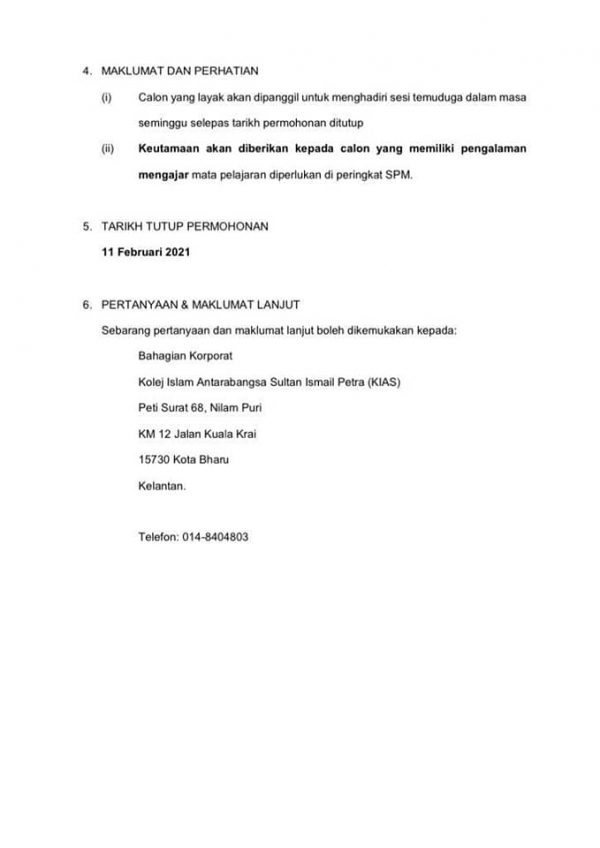Jawatan Kosong Kolej Islam Antarabangsa Sultan Ismail Petra (KIAS) Like serta Ikut Facebook Kami, follow Chanel WhatsApp Jawatan Kosong & Telegram Portal SPA9 untuk capaian pantas kekosongan jawatan daripada kami sekarang.