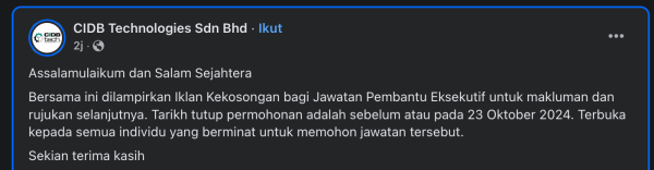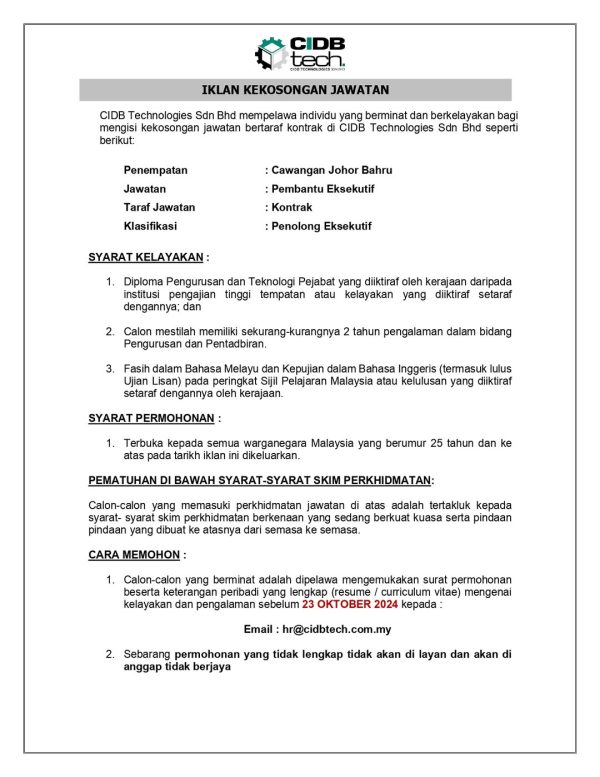 Kini Iklan Jawatan Kosong CIDB Technologies Sdn Bhd Klik Jawatan Disini Like serta Ikut Facebook Kami, follow Chanel WhatsApp Jawatan Kosong & Telegram Portal SPA9 untuk capaian pantas kekosongan jawatan daripada kami sekarang.