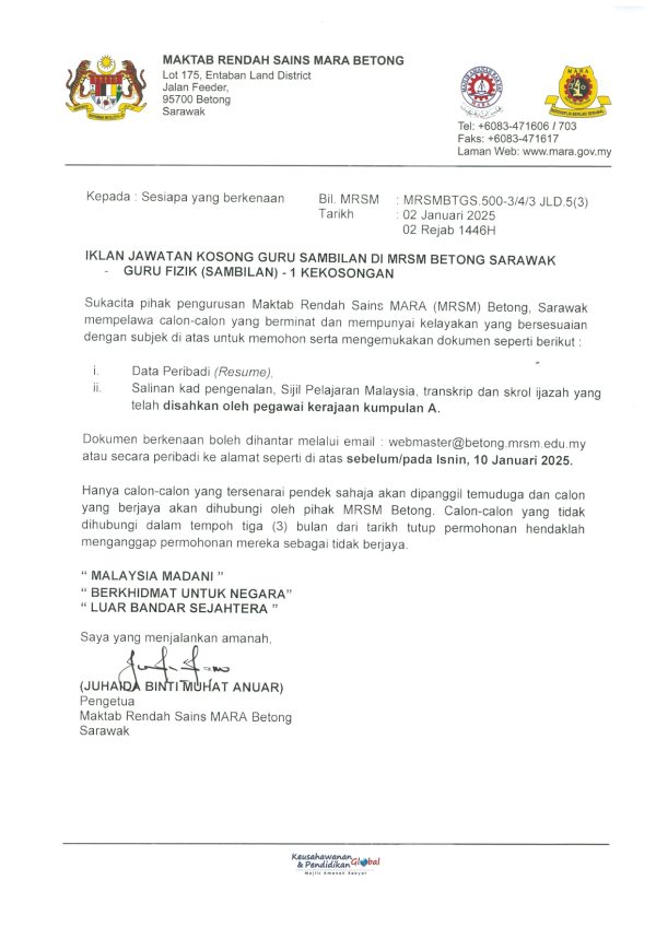 Kini Iklan Jawatan Kosong Guru Sambilan di MRSM Betong Like serta Ikut Facebook Kami, follow Chanel WhatsApp Jawatan Kosong & Telegram Portal SPA9 untuk capaian pantas kekosongan jawatan daripada kami sekarang.
