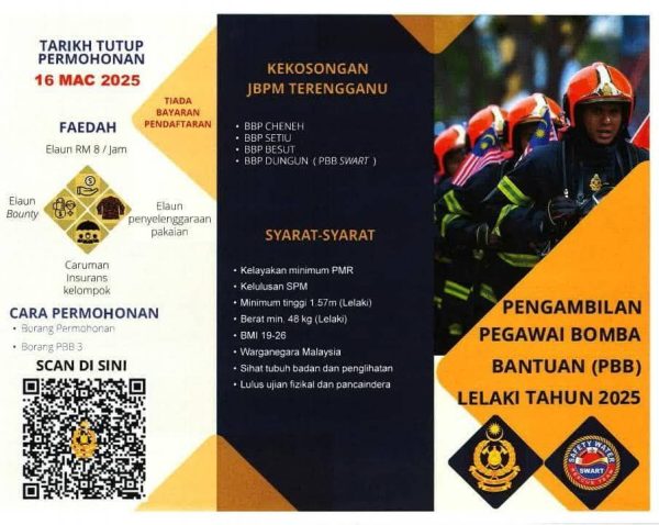 Kini Iklan Jawatan Kosong Jabatan Bomba Dan Penyelamat Malaysia (JBPM) Klik Jawatan Disini Like serta Ikut Facebook Kami, follow Chanel WhatsApp Jawatan Kosong & Telegram Portal SPA9 untuk capaian pantas kekosongan jawatan daripada kami sekarang.