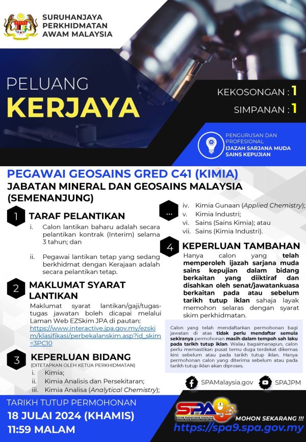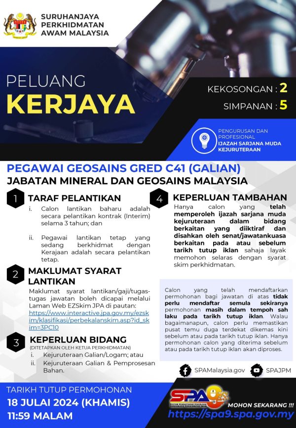 Kini Iklan Jawatan Kosong Jabatan Mineral dan Geosains Malaysia Like serta Ikut Facebook Kami, follow Chanel WhatsApp Jawatan Kosong & Telegram Portal SPA9 untuk capaian pantas kekosongan jawatan daripada kami sekarang. Klik Jawatan Disini
