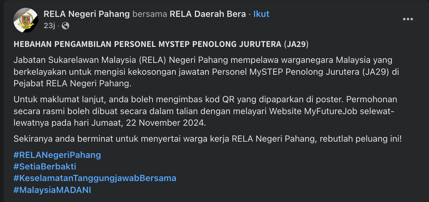 Kini Iklan Jawatan Kosong Jabatan Sukarelawan Malaysia (RELA) Like serta Ikut Facebook Kami, follow Chanel WhatsApp Jawatan Kosong & Telegram Portal SPA9 untuk capaian pantas kekosongan jawatan daripada kami sekarang.