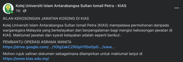 Kini Iklan Jawatan Kosong Kolej Universiti Islam Antarabangsa Sultan Ismail Petra (KIAS) Like serta Ikut Facebook Kami, follow Chanel WhatsApp Jawatan Kosong & Telegram Portal SPA9 untuk capaian pantas kekosongan jawatan daripada kami sekarang. Klik Iklan Jawatan