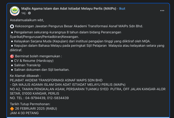 Kini Iklan Jawatan Kosong Majlis Agama Islam Dan Adat Istiadat Melayu Perlis Klik Jawatan Disini Like serta Ikut Facebook Kami, follow Chanel WhatsApp Jawatan Kosong & Telegram Portal SPA9 untuk capaian pantas kekosongan jawatan daripada kami sekarang.