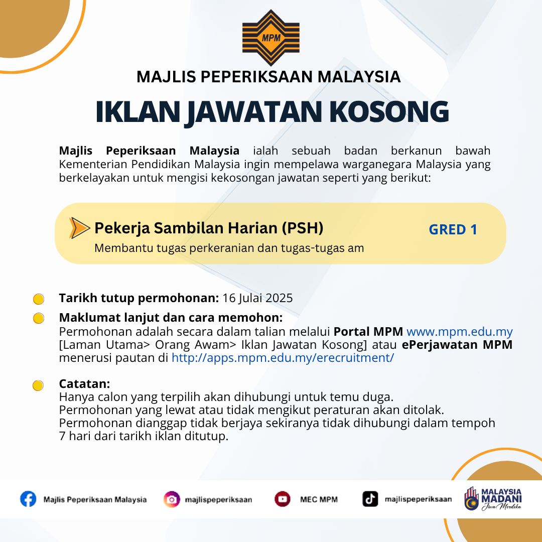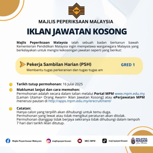 Kini Iklan Jawatan Kosong Majlis Peperiksaan Malaysia (MPM) Like serta Ikut Facebook Kami, follow Chanel WhatsApp Jawatan Kosong & Telegram Portal SPA9 untuk capaian pantas kekosongan jawatan daripada kami sekarang. Klik Jawatan Disini