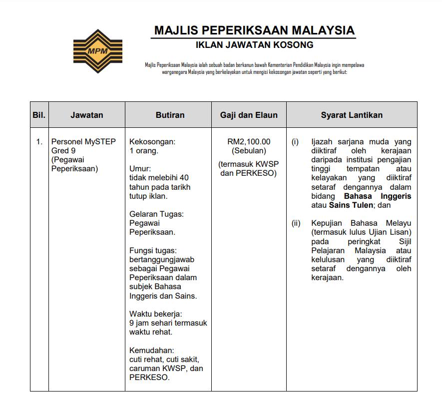 Kini Iklan Jawatan Kosong Majlis Peperiksaan Malaysia (MPM) Like serta Ikut Facebook Kami, follow Chanel WhatsApp Jawatan Kosong & Telegram Portal SPA9 untuk capaian pantas kekosongan jawatan daripada kami sekarang. Klik Jawatan Disini
