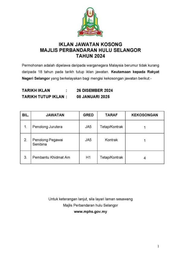 Kini Iklan Jawatan Kosong Majlis Perbandaran Hulu Selangor Like serta Ikut Facebook Kami, follow Chanel WhatsApp Jawatan Kosong & Telegram Portal SPA9 untuk capaian pantas kekosongan jawatan daripada kami sekarang. Klik Iklan Jawatan