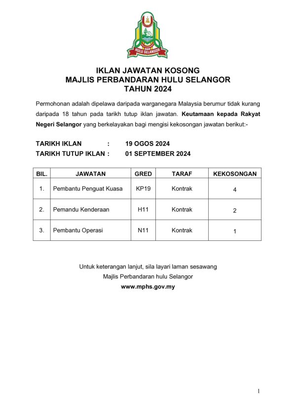 Kini Iklan Jawatan Kosong Majlis Perbandaran Hulu Selangor Like serta Ikut Facebook Kami, follow Chanel WhatsApp Jawatan Kosong & Telegram Portal SPA9 untuk capaian pantas kekosongan jawatan daripada kami sekarang. Klik Jawatan Disini