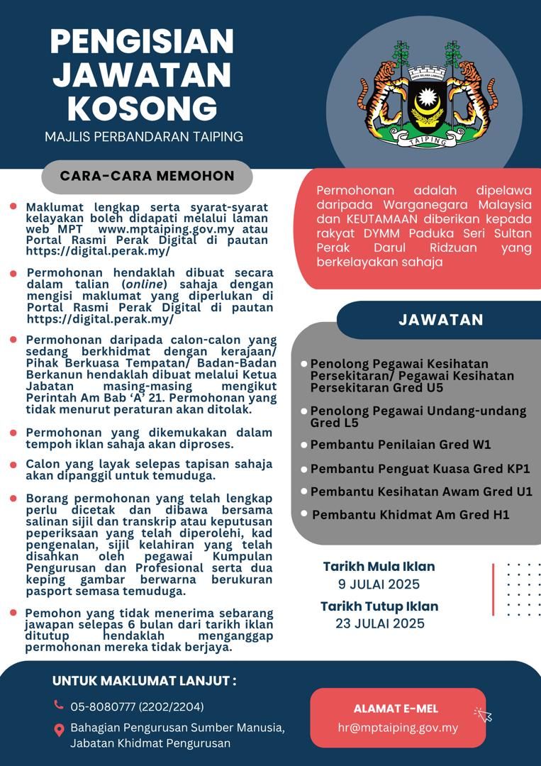 Kini Iklan Jawatan Kosong Majlis Perbandaran Taiping Like serta Ikut Facebook Kami, follow Chanel WhatsApp Jawatan Kosong & Telegram Portal SPA9 untuk capaian pantas kekosongan jawatan daripada kami sekarang. Klik Jawatan Disini