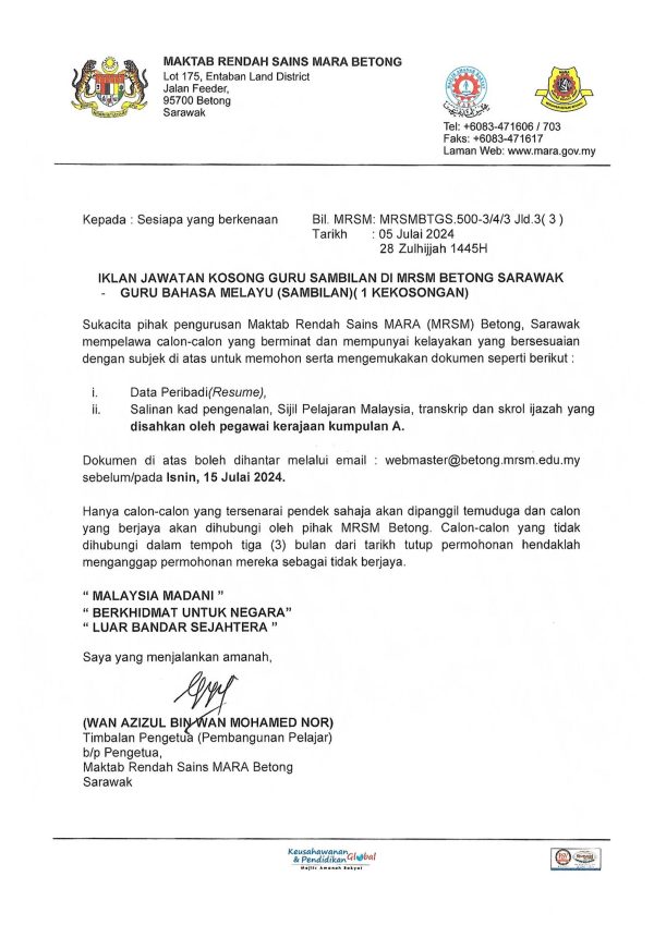 Kini Iklan Jawatan Kosong Maktab Rendah Sains MARA (MRSM) Betong Like serta Ikut Facebook Kami, follow Chanel WhatsApp Jawatan Kosong & Telegram Portal SPA9 untuk capaian pantas kekosongan jawatan daripada kami sekarang. Klik Jawatan Disini