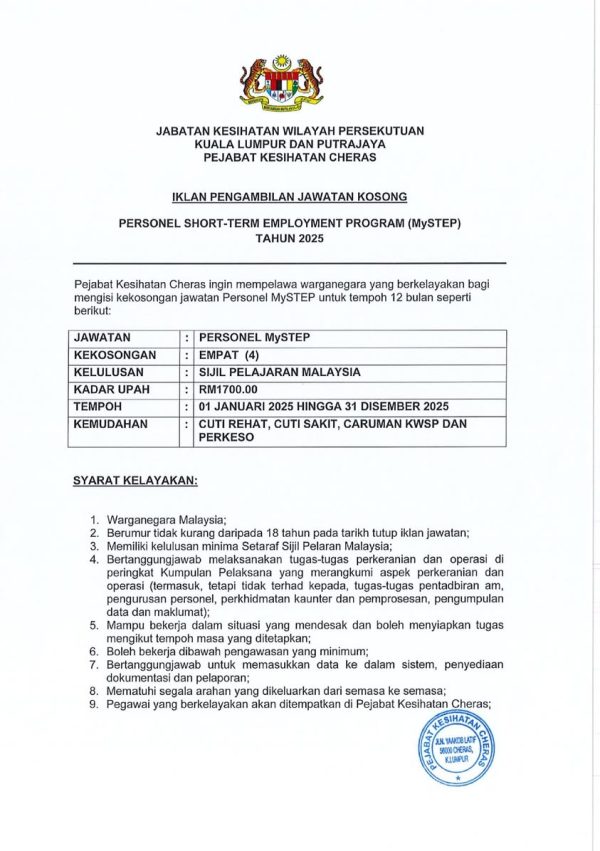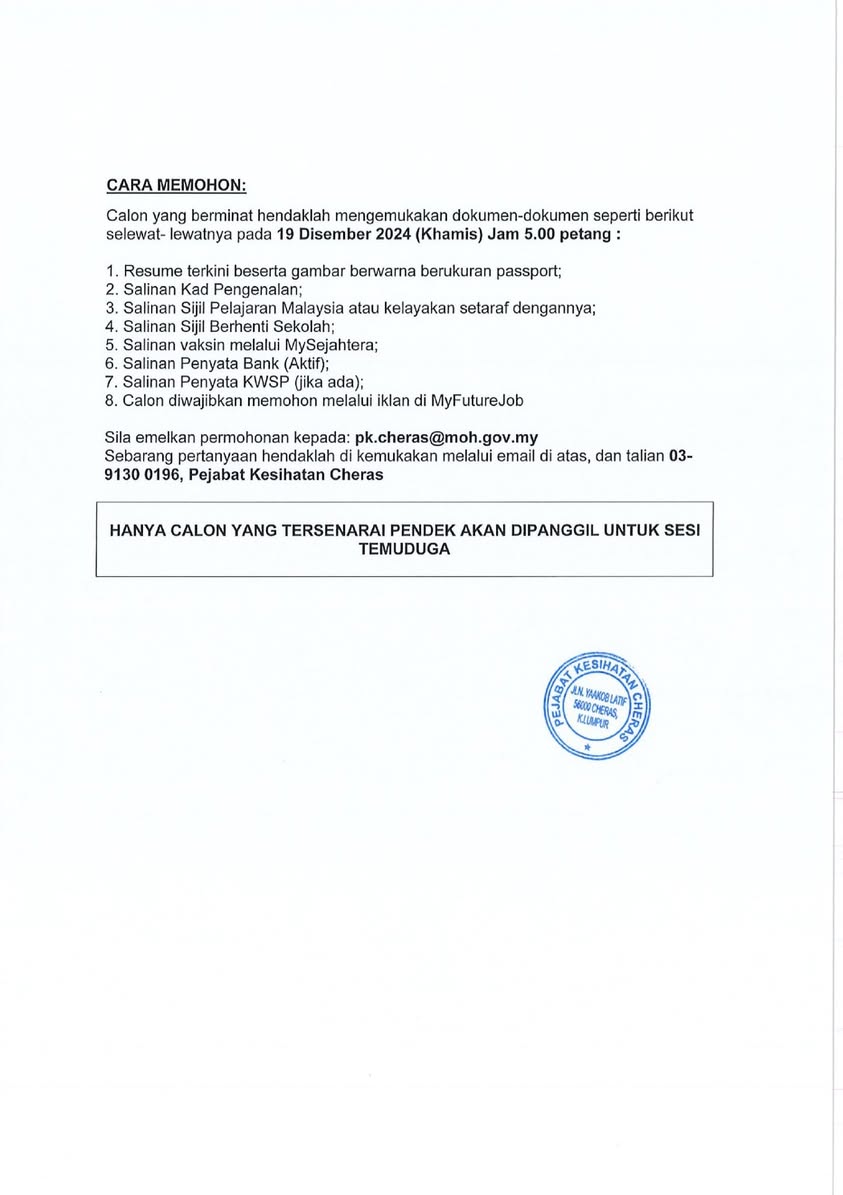 Kini Iklan Jawatan Kosong Pejabat Kesihatan Cheras Like serta Ikut Facebook Kami, follow Chanel WhatsApp Jawatan Kosong & Telegram Portal SPA9 untuk capaian pantas kekosongan jawatan daripada kami sekarang. Klik Iklan Jawatan