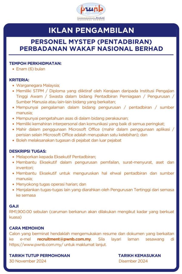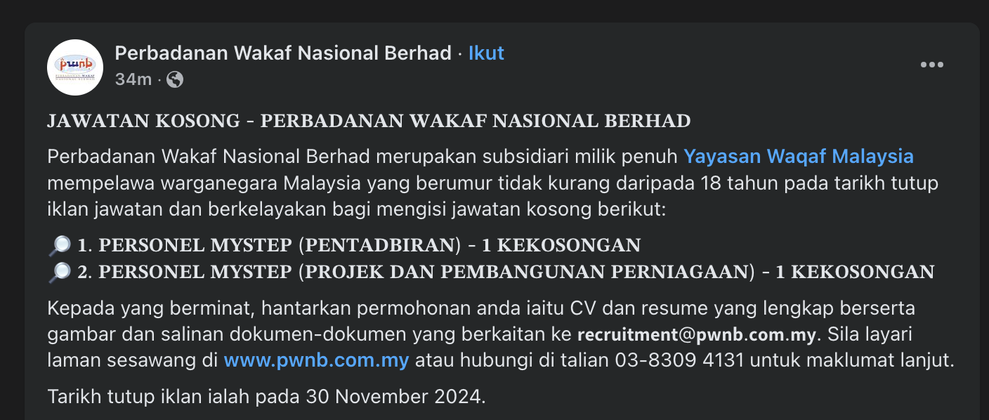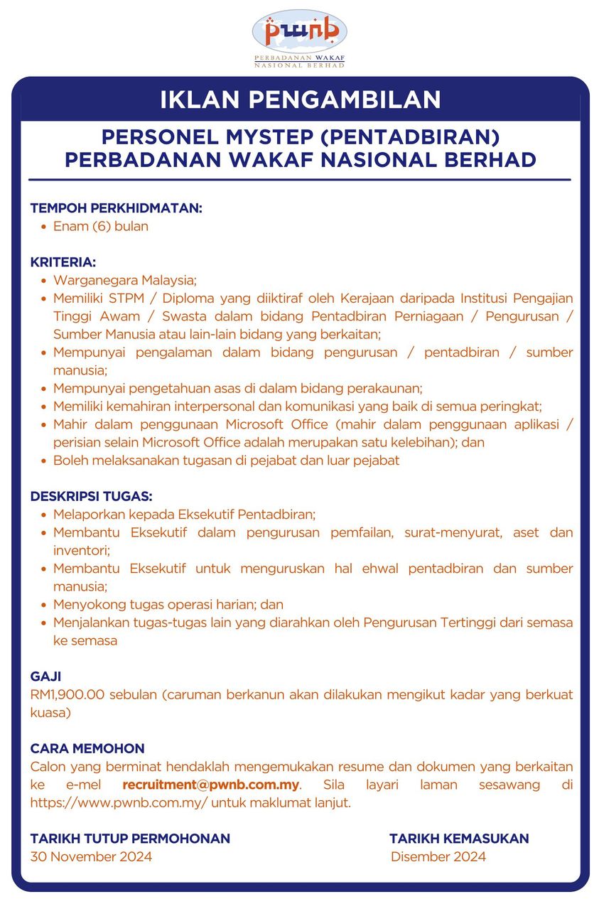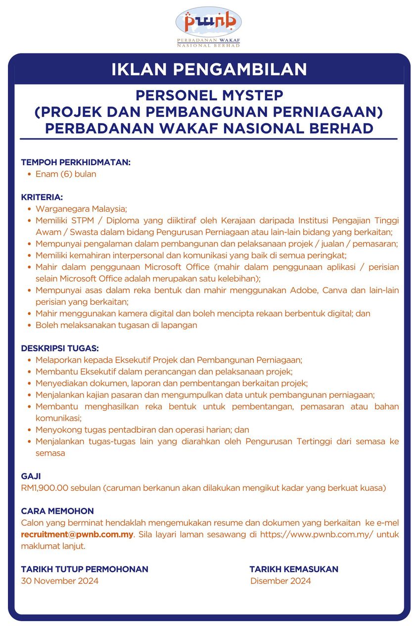 Kini Iklan Jawatan Kosong Perbadanan Wakaf Nasional Berhad Klik Iklan Jawatan Like serta Ikut Facebook Kami, follow Chanel WhatsApp Jawatan Kosong & Telegram Portal SPA9 untuk capaian pantas kekosongan jawatan daripada kami sekarang.