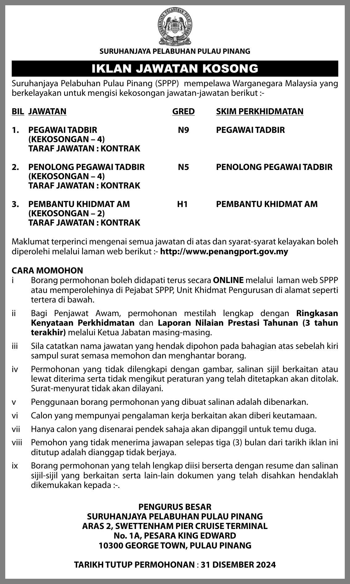 Kini Iklan Jawatan Kosong Suruhanjaya Pelabuhan Pulau Pinang c1579387a.pdf Like serta Ikut Facebook Kami, follow Chanel WhatsApp Jawatan Kosong & Telegram Portal SPA9 untuk capaian pantas kekosongan jawatan daripada kami sekarang.
