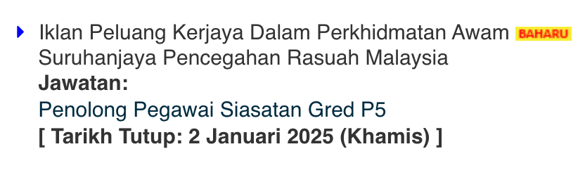 Kini Iklan Jawatan Kosong Suruhanjaya Pencegahan Rasuah Malaysia Like serta Ikut Facebook Kami, follow Chanel WhatsApp Jawatan Kosong & Telegram Portal SPA9 untuk capaian pantas kekosongan jawatan daripada kami sekarang. Klik Iklan Jawatan