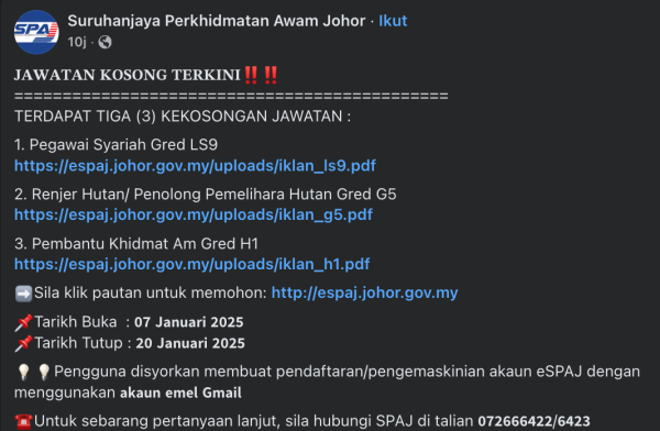 Kini Iklan Jawatan Kosong Suruhanjaya Perkhidmatan Awam Johor (SPAJ) Like serta Ikut Facebook Kami, follow Chanel WhatsApp Jawatan Kosong & Telegram Portal SPA9 untuk capaian pantas kekosongan jawatan daripada kami sekarang. Klik Iklan Jawatan