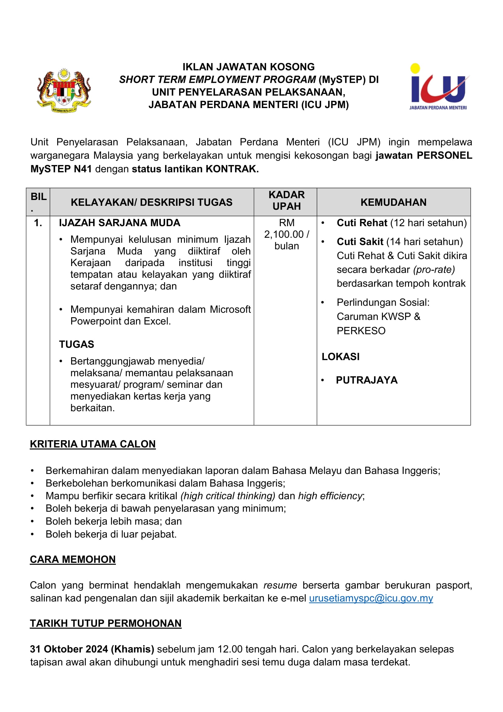 Kini Iklan Jawatan Kosong Terkini Jabatan Perdana Menteri (JPM) Like serta Ikut Facebook Kami, follow Chanel WhatsApp Jawatan Kosong & Telegram Portal SPA9 untuk capaian pantas kekosongan jawatan daripada kami sekarang. Klik Jawatan Disini
