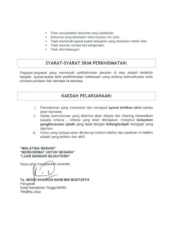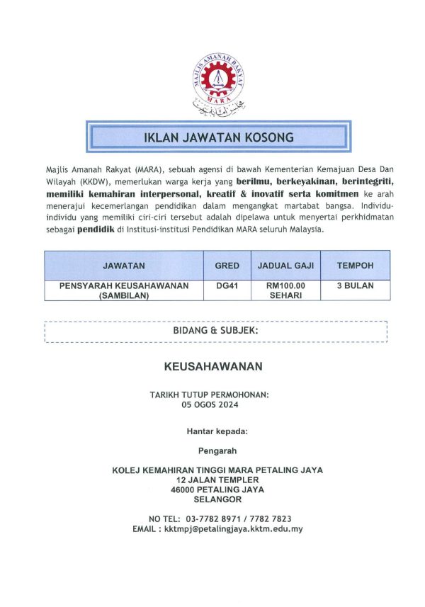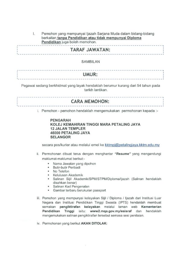 Kini Iklan Jawatan Kosong Terkini Kolej Kemahiran Tinggi MARA (KKTM) Like serta Ikut Facebook Kami, follow Chanel WhatsApp Jawatan Kosong & Telegram Portal SPA9 untuk capaian pantas kekosongan jawatan daripada kami sekarang. Klik Jawatan Disini