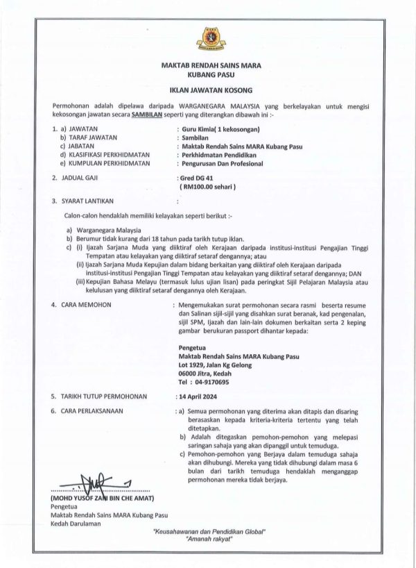 Kini IKlan Jawatan Kosong Terkini Maktab Rendah Sains MARA (MRSM) ~ Guru Sambilan Like serta Ikut Facebook Kami, follow Chanel WhatsApp Jawatan Kosong & Telegram Portal SPA9 untuk capaian pantas kekosongan jawatan daripada kami sekarang.