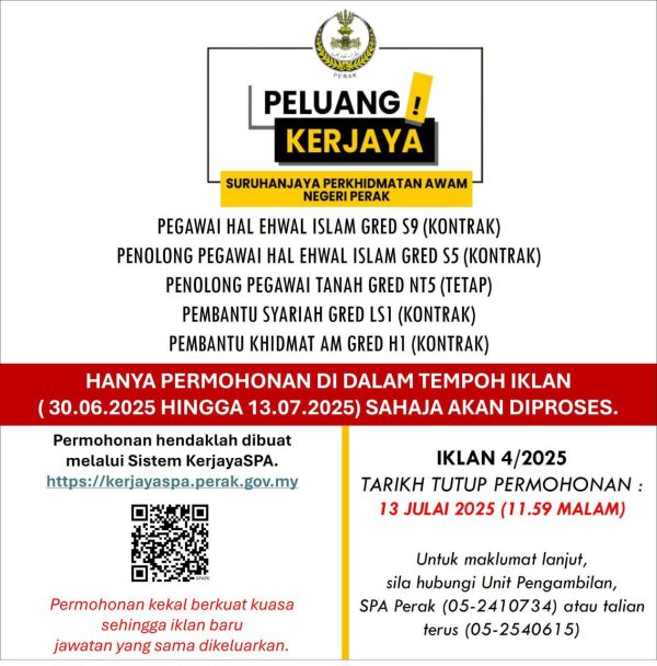 Kini Iklan Jawatan Kosong Terkini Suruhanjaya Perkhidmatan Awam Negeri Perak Darul Ridzuan Like serta Ikut Facebook Kami, follow Chanel WhatsApp Jawatan Kosong & Telegram Portal SPA9 untuk capaian pantas kekosongan jawatan daripada kami sekarang. Klik Jawatan Disini