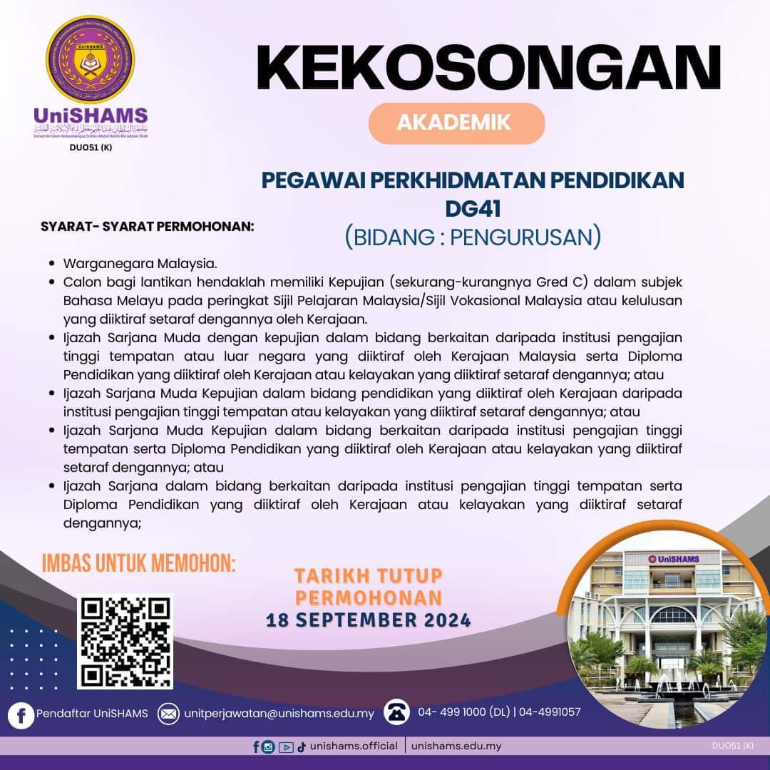 Kini Iklan Jawatan Kosong Universiti Islam Antarabangsa Sultan Abdul Halim Mu’adzam Shah (UniSHAMS)