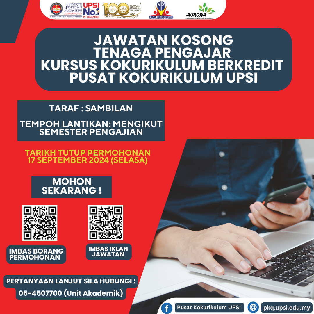 Kini Iklan Jawatan Kosong Universiti Pendidikan Sultan Idris (UPSI) Like serta Ikut Facebook Kami, follow Chanel WhatsApp Jawatan Kosong & Telegram Portal SPA9 untuk capaian pantas kekosongan jawatan daripada kami sekarang. Klik Jawatan Disini