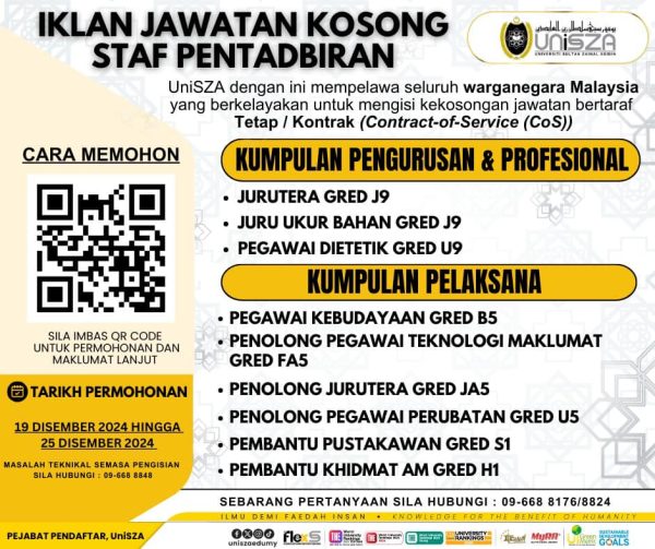 Kini Iklan Jawatan Kosong Universiti Sultan Zainal Abidin (UNISZA) Like serta Ikut Facebook Kami, follow Chanel WhatsApp Jawatan Kosong & Telegram Portal SPA9 untuk capaian pantas kekosongan jawatan daripada kami sekarang. Klik Iklan Jawatan