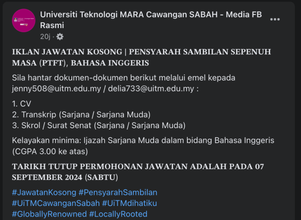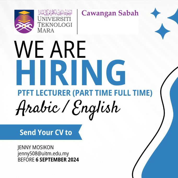 Kini Iklan Jawatan Kosong Universiti Teknologi MARA (UiTM) Sabah Like serta Ikut Facebook Kami, follow Chanel WhatsApp Jawatan Kosong & Telegram Portal SPA9 untuk capaian pantas kekosongan jawatan daripada kami sekarang.