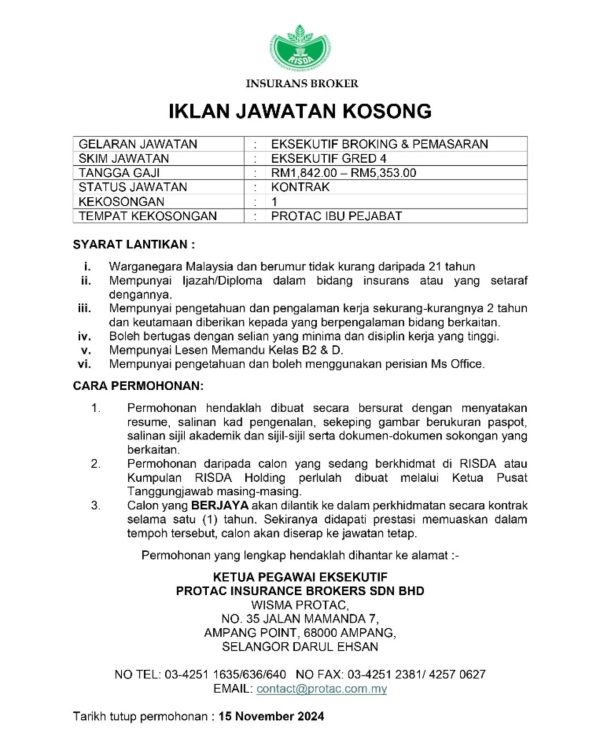 Kini Iklan Protac Insurance Brokers Sdn Bhd Like serta Ikut Facebook Kami, follow Chanel WhatsApp Jawatan Kosong & Telegram Portal SPA9 untuk capaian pantas kekosongan jawatan daripada kami sekarang. Klik Jawatan Disini