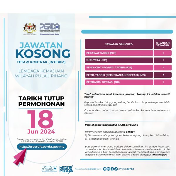 Kini Jawatan Kosong Lembaga Kemajuan Wilayah Pulau Pinang (PERDA) Like serta Ikut Facebook Kami, follow Chanel WhatsApp Jawatan Kosong & Telegram Portal SPA9 untuk capaian pantas kekosongan jawatan daripada kami sekarang. Klik Jawatan Disini