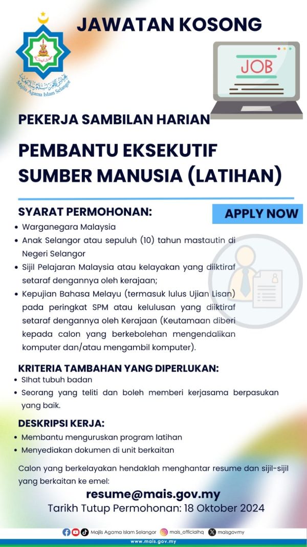 Kini Jawatan Kosong Majlis Agama Islam Selangor (MAIS) Like serta Ikut Facebook Kami, follow Chanel WhatsApp Jawatan Kosong & Telegram Portal SPA9 untuk capaian pantas kekosongan jawatan daripada kami sekarang. Klik Jawatan Disini