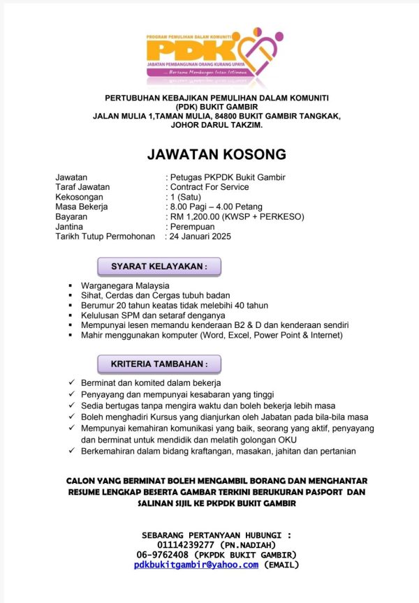 Kini Jawatan Pertubuhan Kebajikan Pemulihan Dalam Komuniti (PDK) Klik Iklan Jawatan Like serta Ikut Facebook Kami, follow Chanel WhatsApp Jawatan Kosong & Telegram Portal SPA9 untuk capaian pantas kekosongan jawatan daripada kami sekarang.