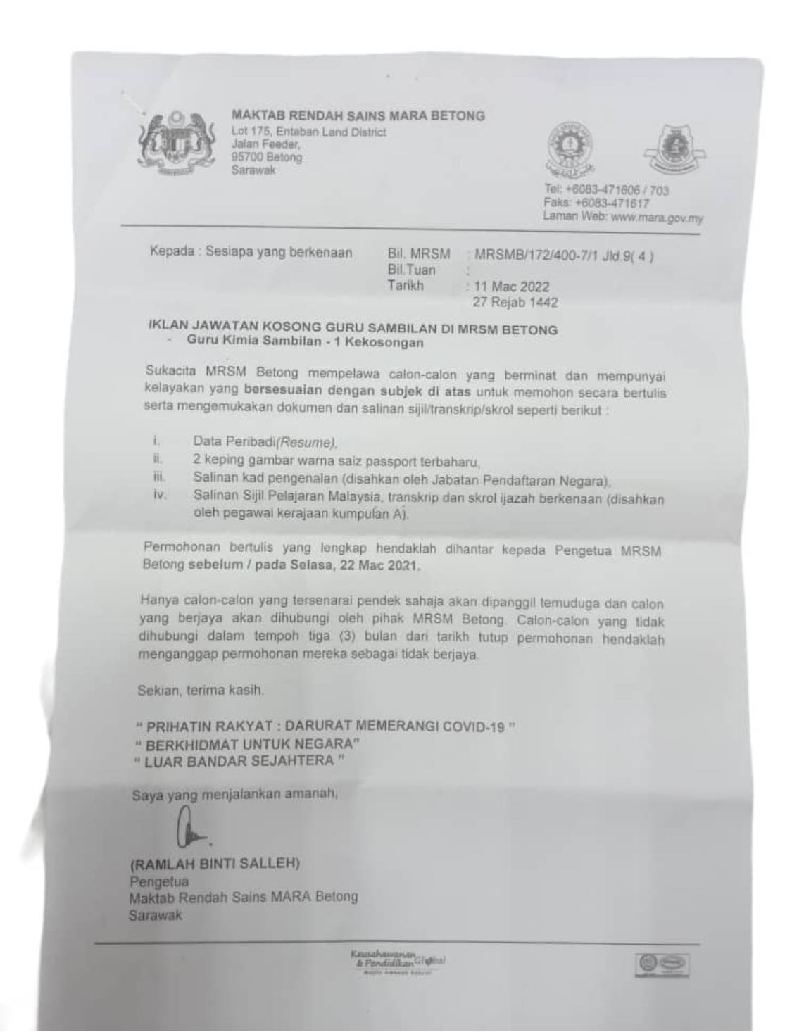 Jawatan Kosong Maktab Rendah Sains Mara Bentong