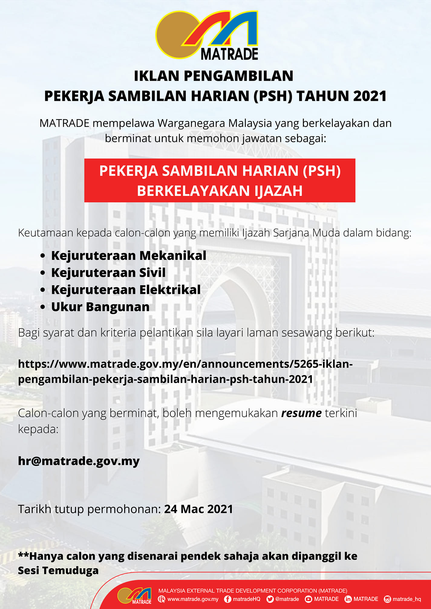 Jawatan Kosong Perbadanan Pembangunan Perdagangan Luar Malaysia (MATRADE) Like serta Ikut Facebook Kami, follow Chanel WhatsApp Jawatan Kosong & Telegram Portal SPA9 untuk capaian pantas kekosongan jawatan daripada kami sekarang.