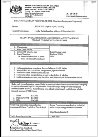 Jawatan Kosong Pejabat Pendidikan Daerah Kapit