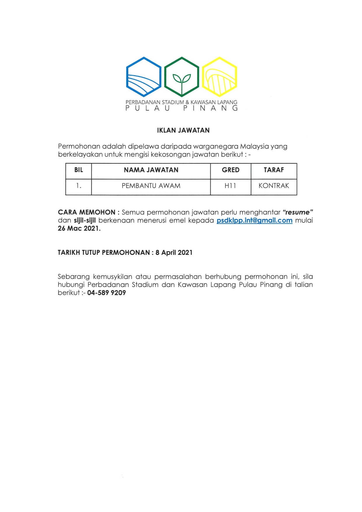 Jawatan Kosong Perbadanan Stadium & Kawasan Lapang Pulau Pinang Like serta Ikut Facebook Kami, follow Chanel WhatsApp Jawatan Kosong & Telegram Portal SPA9 untuk capaian pantas kekosongan jawatan daripada kami sekarang.