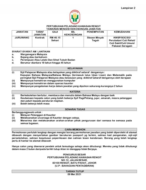 Jawatan Kosong Pertubuhan Peladang Kawasan Rengit Like serta Ikut Facebook Kami, follow Chanel WhatsApp Jawatan Kosong & Telegram Portal SPA9 untuk capaian pantas kekosongan jawatan daripada kami sekarang.