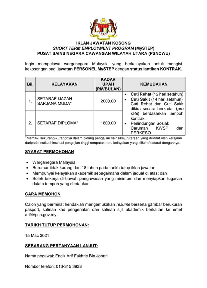Jawatan Kosong Pusat Sains Negara Wilayah Utara Like serta Ikut Facebook Kami, follow Chanel WhatsApp Jawatan Kosong & Telegram Portal SPA9 untuk capaian pantas kekosongan jawatan daripada kami sekarang.