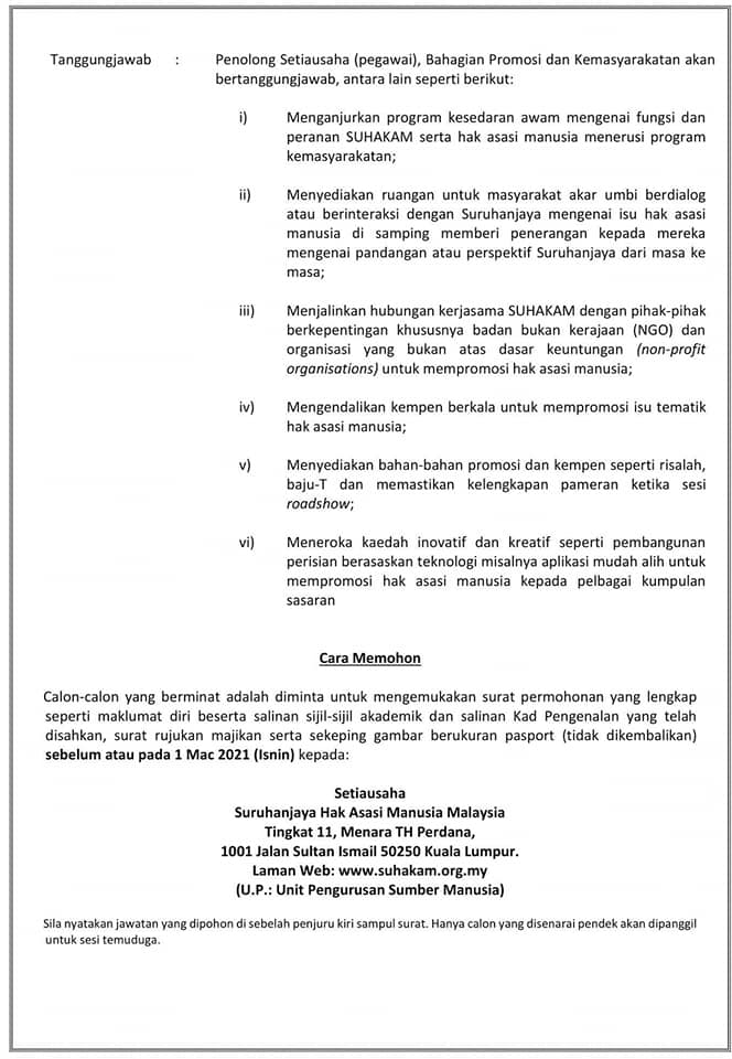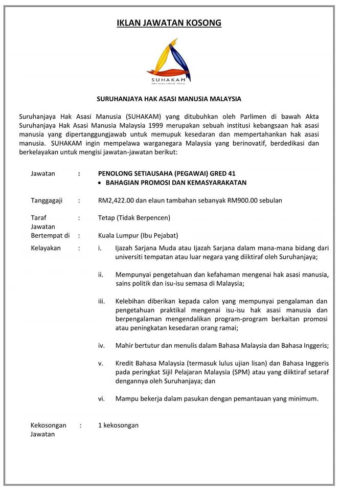 Jawatan Kosong Suruhanja Hak Asasi Manusia Malaysia