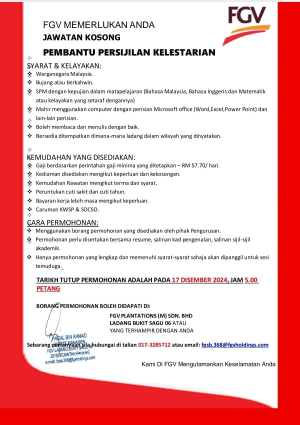 Terkini Iklan Jawatan Kosong FGV Plantations (Malaysia) Sdn Bhd Like serta Ikut Facebook Kami, follow Chanel WhatsApp Jawatan Kosong & Telegram Portal SPA9 untuk capaian pantas kekosongan jawatan daripada kami sekarang.
